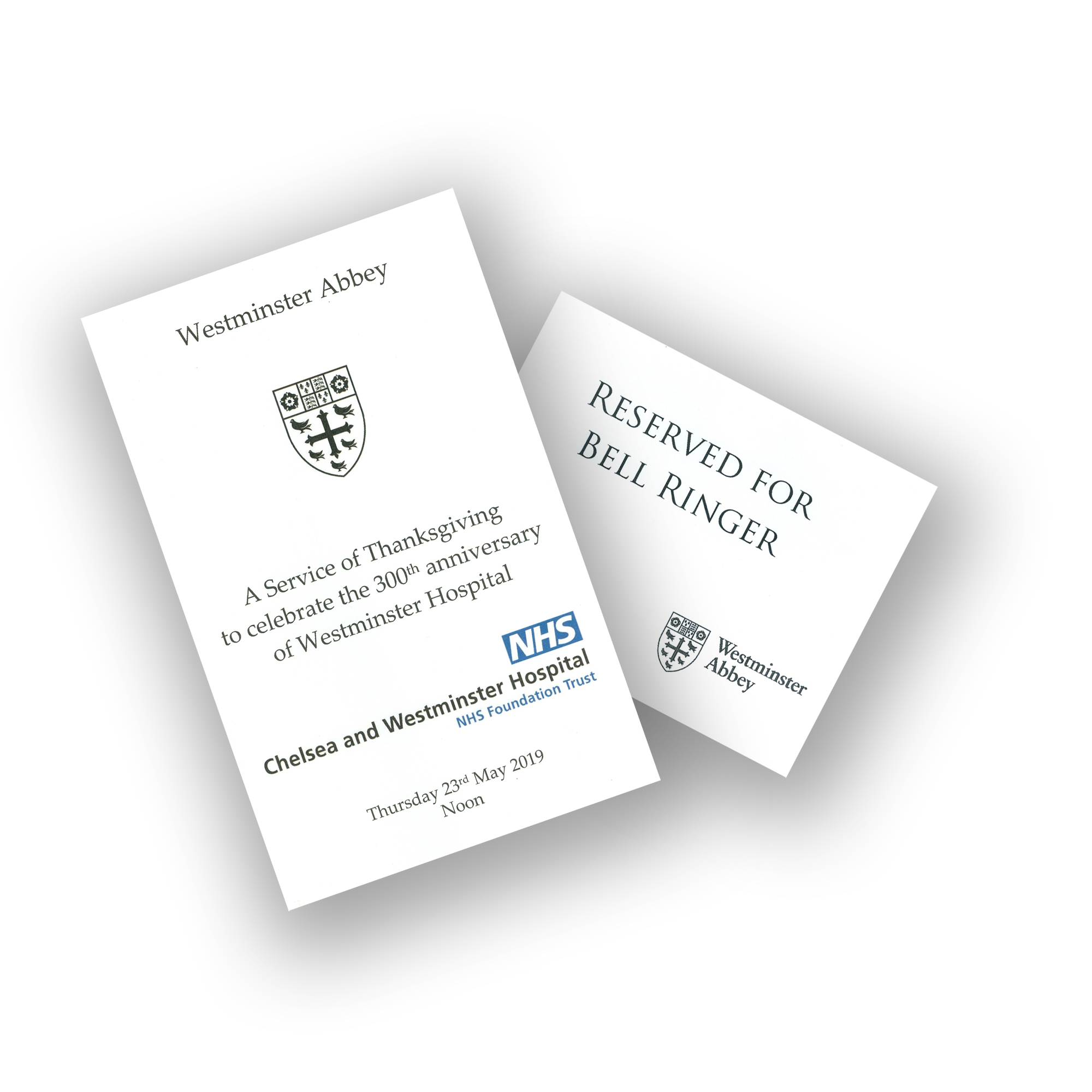 The hospital’s own charity, CW+, organised a special service to celebrate the hospital’s 300th anniversary at Westminster Abbey on 23rd May 2019. As President of the Medical Guild and a former employee of the hospital I enquired if it would be possible for the Guild to be represented in the ringing after the service. I am grateful to the Abbey Company for inviting three Guild members to ring with them – two who worked in the Westminster Hospital group in the past together with the current Guild Master. I am also grateful to CW+ for arranging for the three of us to attend the service.