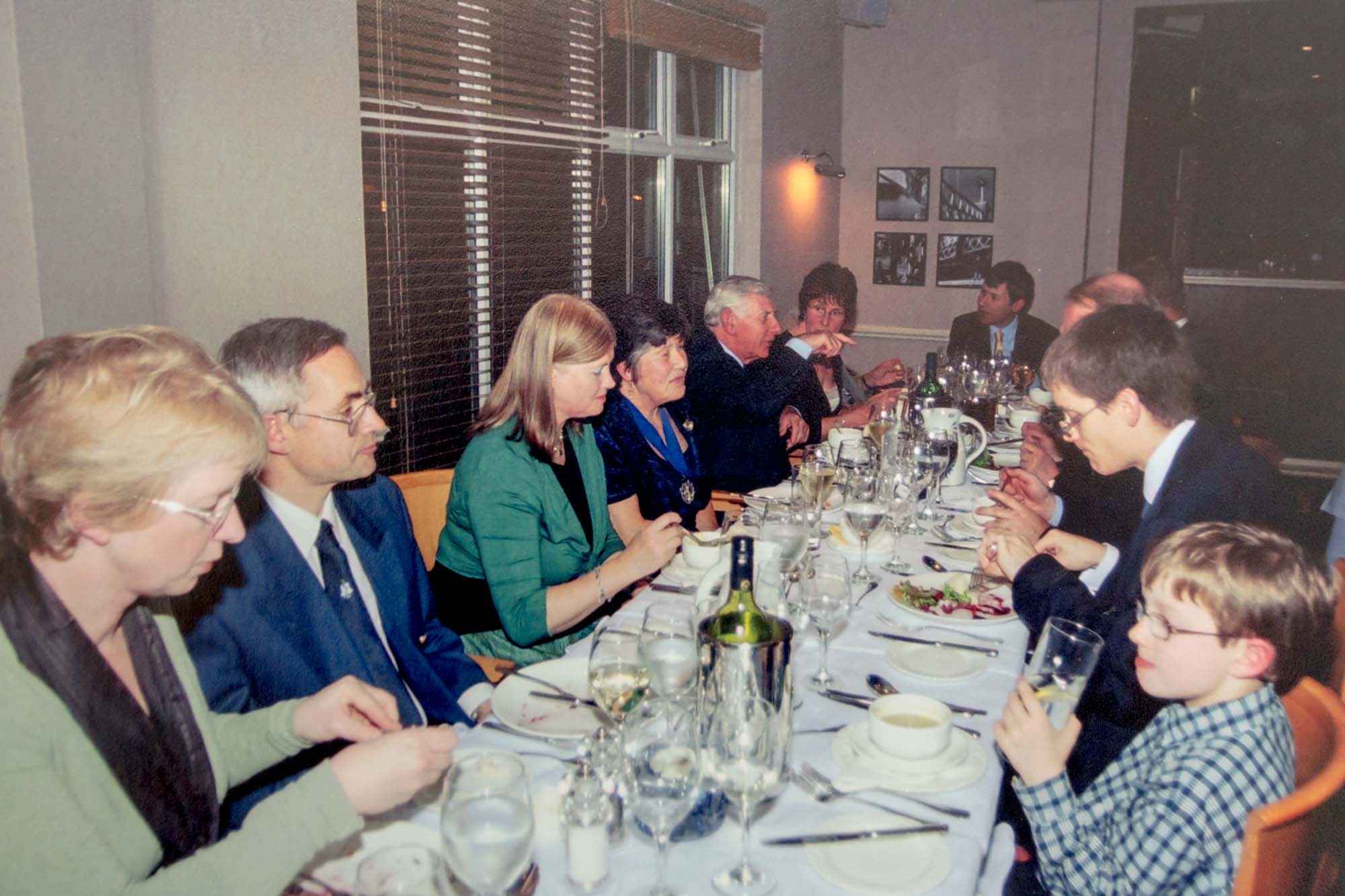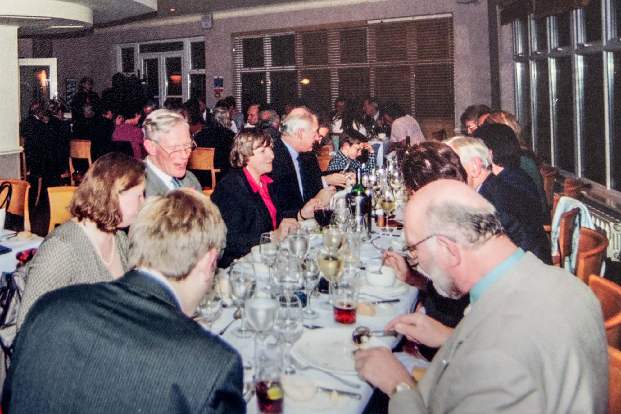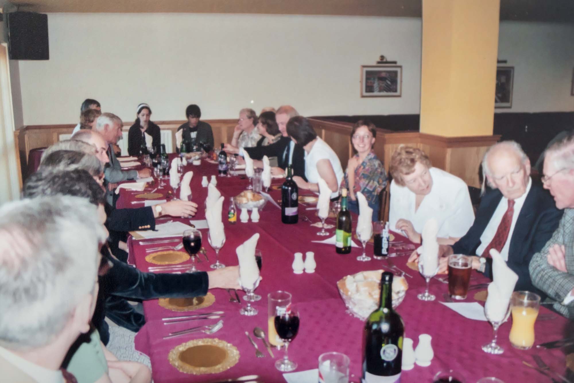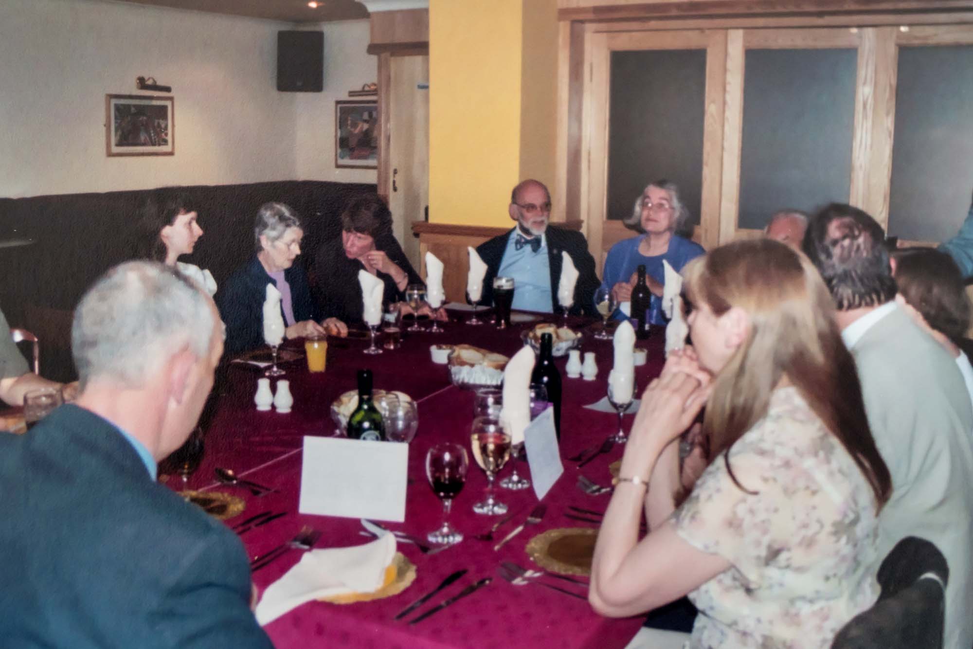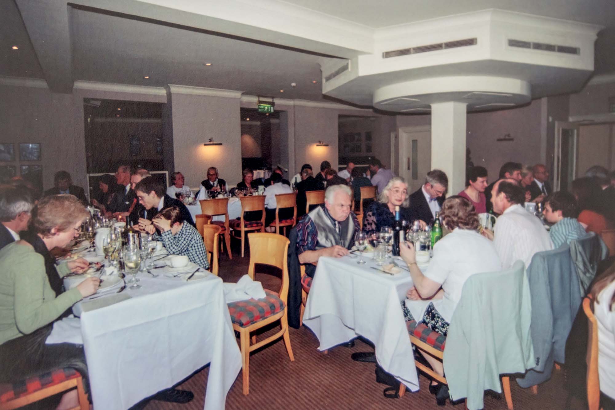 Dinner was held in the nearby Thames Lodge Hotel where we had booked the upper floor of the restaurant overlooking the Thames. Before dinner we had a chance for a drink in the bar, a group photograph and an opportunity to admire the Guild anniversary cake so beautifully made and iced by Wendy Lee and her sister Barbara. The restaurant coped admirably with our individually pre-ordered menu and fifty-nine of us, including four children, sat to the meal. As it was Guy Fawkes Night we were entertained by some stunning firework displays across the river and all at no extra cost!