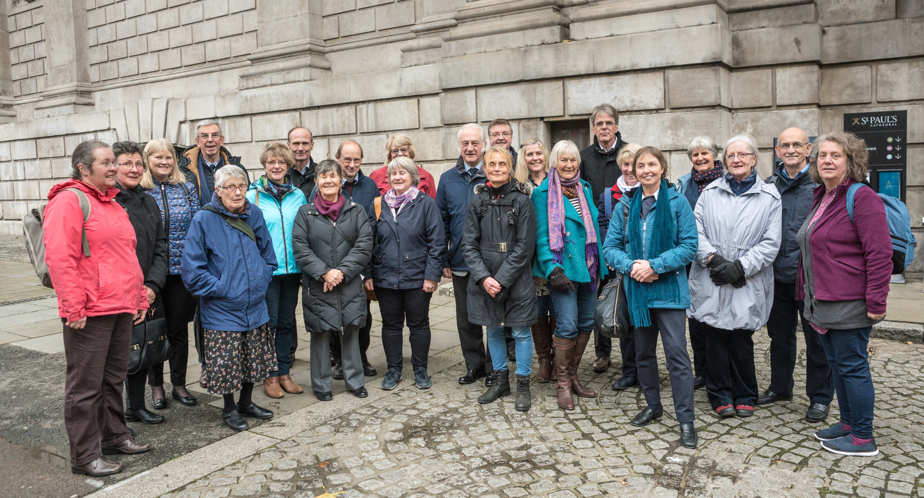 However, the highlight of the day was unquestionably the invitation we had received to view the newly refurbished and rehung twelve bells of St Paul’s Cathedral. We are immensely grateful to Lucy Woodward for giving up her afternoon to show us around and also to Geraldine who was able to be an additional guide so we were able to accommodate 24 people on the tour, some others having had the opportunity in the past to visit. We gathered at the crypt entrance at 3 pm and climbed the stairs and moved through the sewing room, viewed the spiral staircase used for filming in Harry Potter, past some of the stonework preserved from the original cathedral burnt down in the Great Fire of London, and into the ringing chamber. The walls here have painted peal boards with very many famous names who rung in peals to mark many events of national significance. One of our previous Presidents, Phillip Chalk, was a regular ringer here. Absolutely no photographs are allowed in the crypt and the journey up, but are allowed in the ringing chamber, so we had a group photograph there. We then climbed a little higher to see the refurbished bells hanging in their original frame. This was s very memorable afternoon.